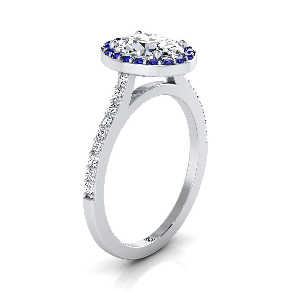 แหวนหมั้นแบบคลาสสิกทรงรีทองคำขาว 14K ฝรั่งเศสประดับเพชรแบบปาเว่ล้อมด้วยไพลินสีน้ำเงินและเส้นตรง - 1/6 กะรัตรวม