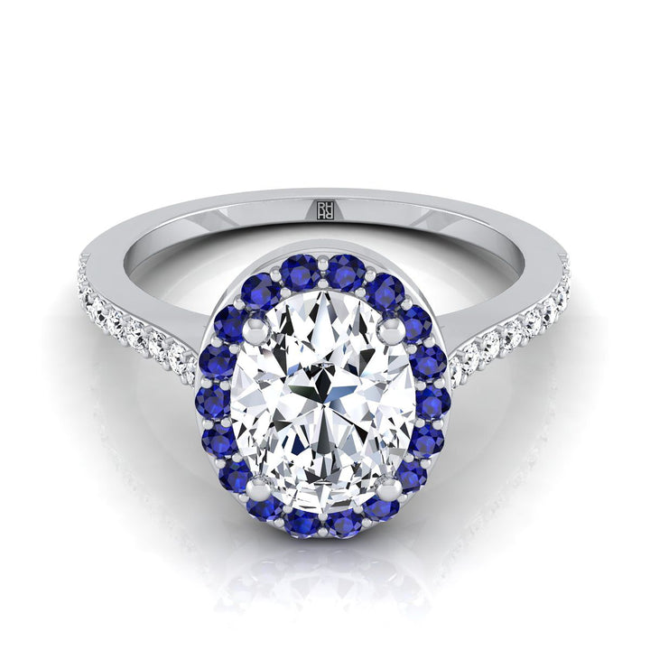แหวนหมั้นแพลทินัมรูปวงรีคลาสสิกฝรั่งเศสประดับบลูแซฟไฟร์แบบฮาโลและเส้นตรง -1/6ctw