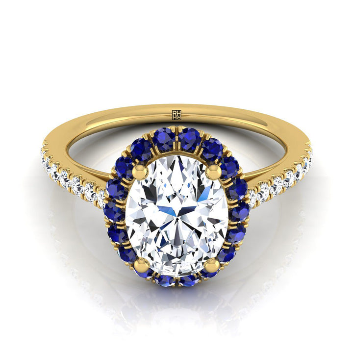 แหวนหมั้นเพชรรูปวงรีที่ทำด้วยมืออย่างประณีตนี้ โชว์เพชรเจียระไนแบบ Brilliant Cut (h-i/vs 0.20ctw) และไพลินทรงกลมที่ประดับอย่างสวยงามในตัวเรือนทองคำเหลือง 18k แบบคลาสสิก