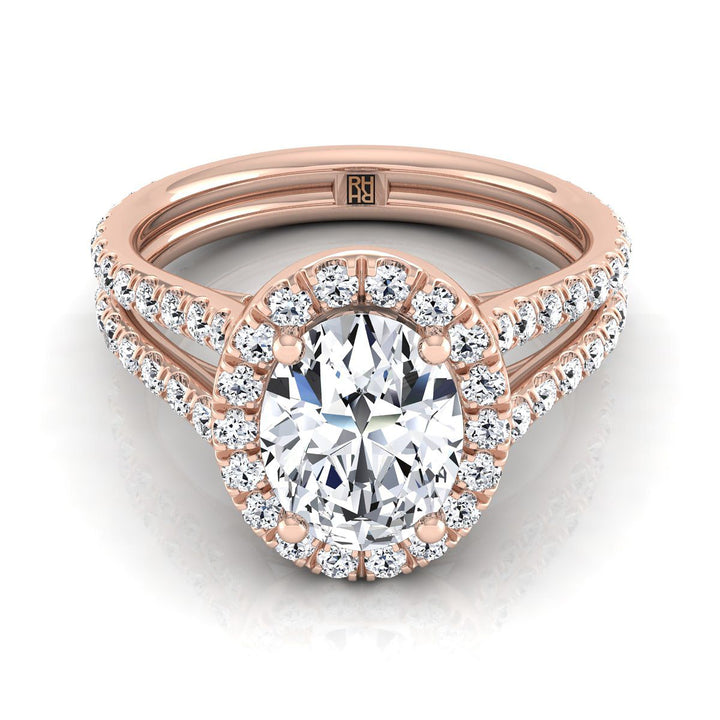 แหวนหมั้นทองคำชมพู 14K รูปไข่ ประดับเพชรฮาโลสองแถวแบบปาเว่ พร้อมชานแยก 7/8 กะรัตรวม