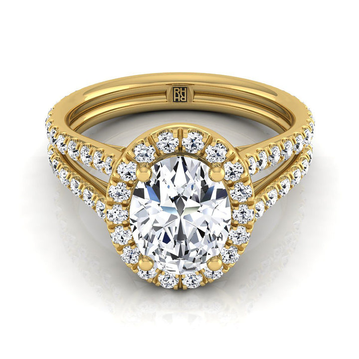 แหวนหมั้นทองคำเหลือง 14K รูปวงรี ประดับเพชรแบบฮาโล สองแถว แบบแยกช้าง -7/8ctw