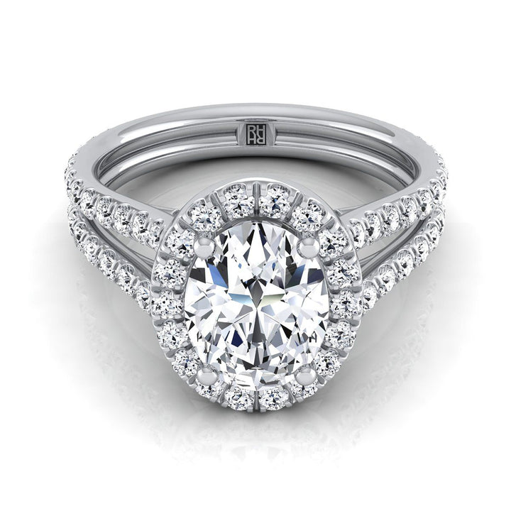 แหวนหมั้นทองคำขาว 18K รูปไข่ ประดับเพชรฮาโลสองแถวแบบปาเว่ พร้อมชานแยก - 7/8ctw