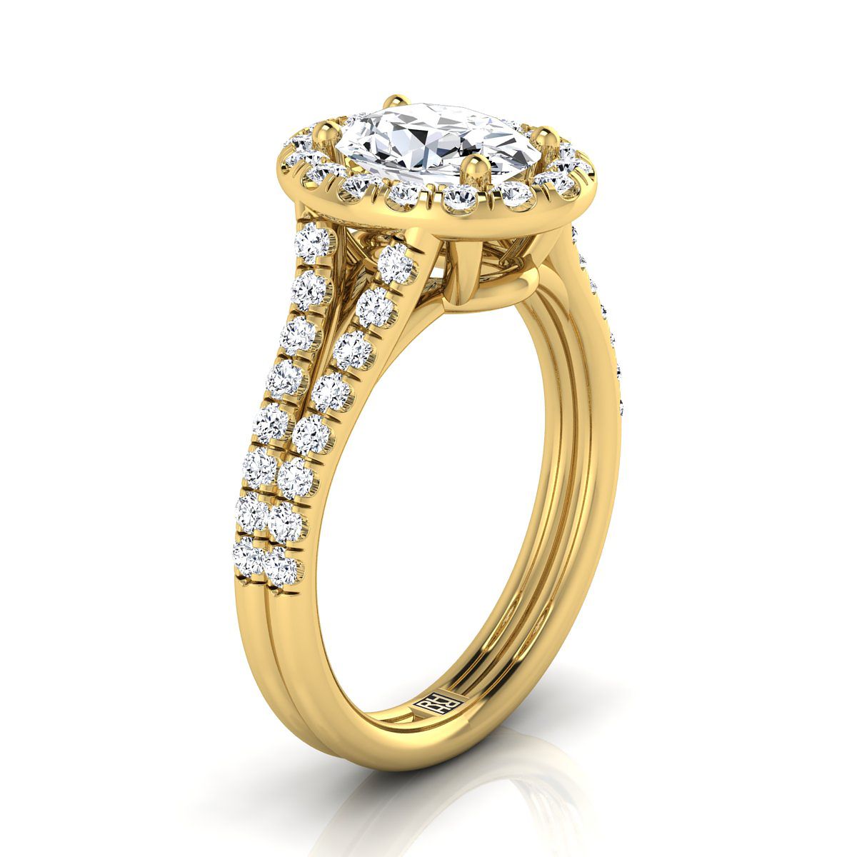 แหวนหมั้นทองคำเหลือง 18K รูปไข่ ประดับเพชรแบบฝรั่งเศส พาฟเว่ แยกชั้น ฮาโล -5/8ctw