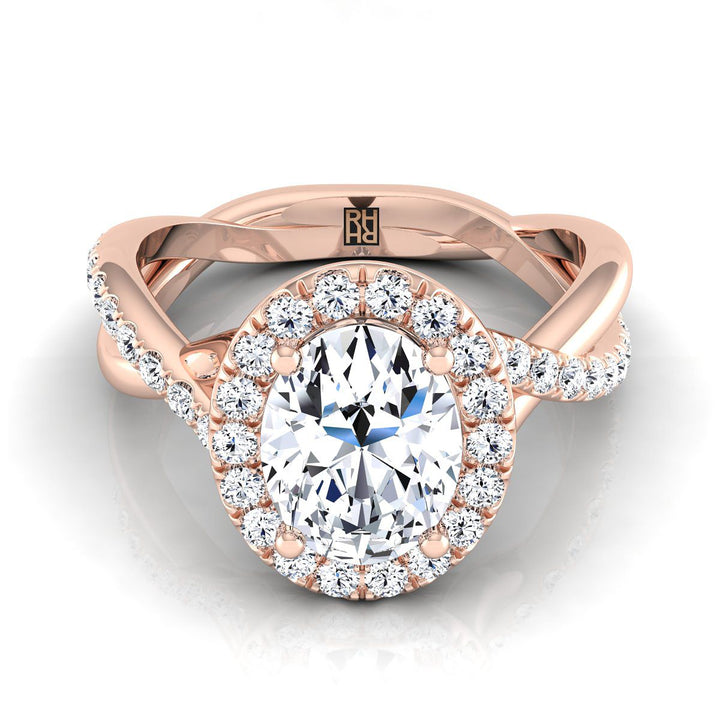 แถลงการณ์สไตล์สมัยใหม่ แหวนหมั้นวงรี Halo Pave นี้พร้อมแถบวงแหวน Infinity โชว์เพชรเจียระไนแบบ Brilliant Cut (h-i/vs 0.45ctw) ติดตั้งในตัวเรือนทองกุหลาบ 14k.