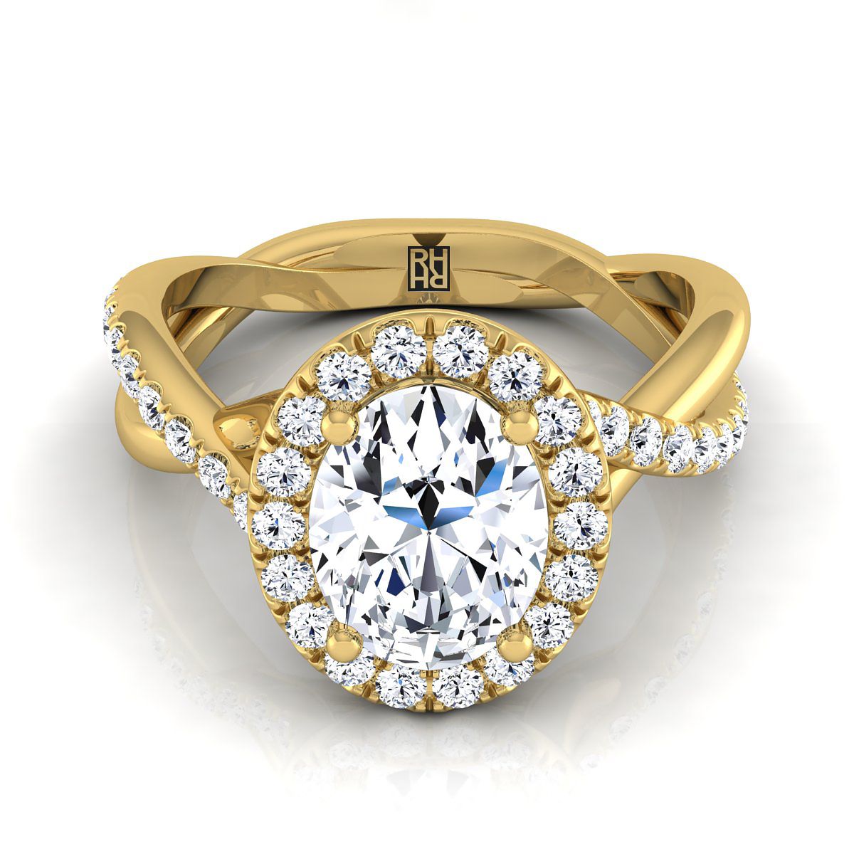 แถลงการณ์สไตล์สมัยใหม่ แหวนหมั้นวงรี Halo Pave นี้พร้อมแถบวงแหวน Infinity โชว์เพชรเจียระไนแบบ Brilliant Cut (h-i/vs 0.45ctw) ติดตั้งในตัวเรือนทองคำ 14k สีเหลือง