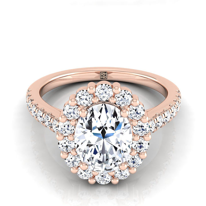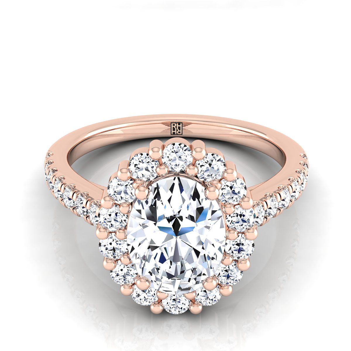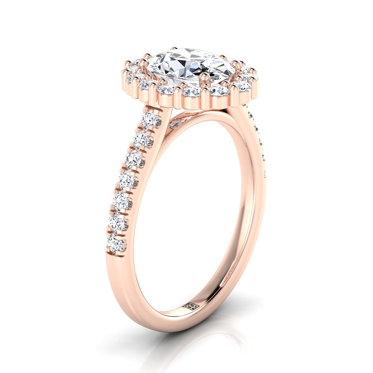 แหวนหมั้นรูปวงรีแบบฮาโลที่สง่างามนี้พร้อมกับแถบเพชรแบบเพฟแสดงให้เห็นเพชรเจียระไนแบบบริลเลียนต์ (h-i/vs 0.60ctw) ที่ประดับอย่างสวยงามในตัวเรือนทองกุหลาบ 14 กะรัตแบบคลาสสิก
