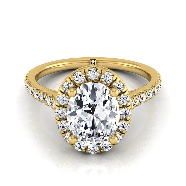 แสดงออกถึงสไตล์ที่สง่างาม แหวนหมั้นรูปวงรีแบบฮาโลนี้พร้อมชิ้นส่วนเพชรปาเว่แสดงให้เห็นเพชรเจียระไนแบบบริลเลียนต์ (h-i/vs 0.40ctw) ที่ถูกจัดวางอย่างสวยงามในตัวเรือนทองคำเหลือง 18 กะรัตแบบคลาสสิก