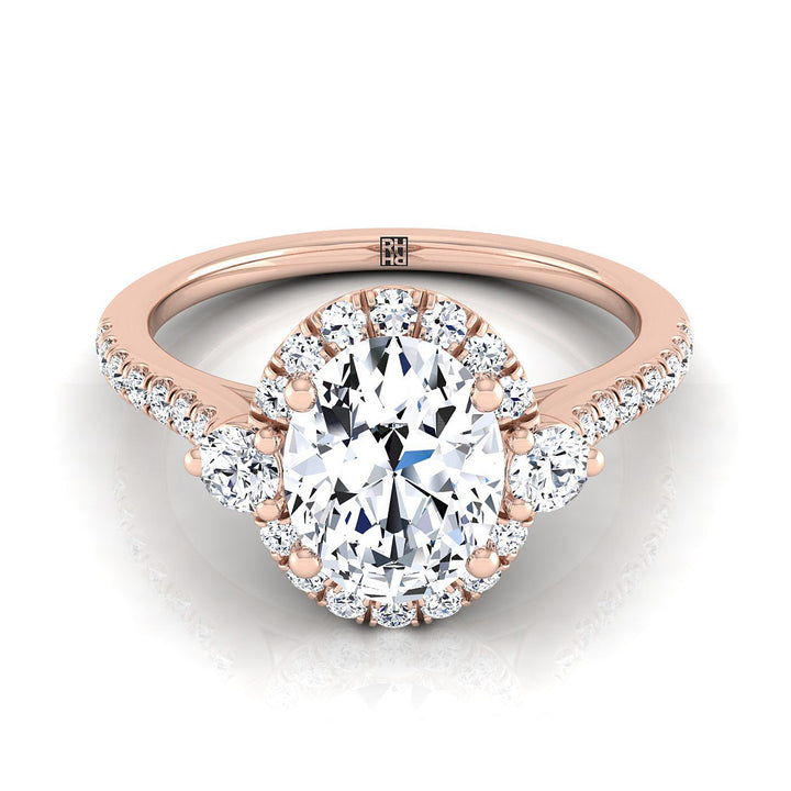แหวนหมั้นสามเม็ดเพชรรูปวงรีทองกุหลาบ 14K พร้อมฮาโลเดลิเคท - 1/3ctw