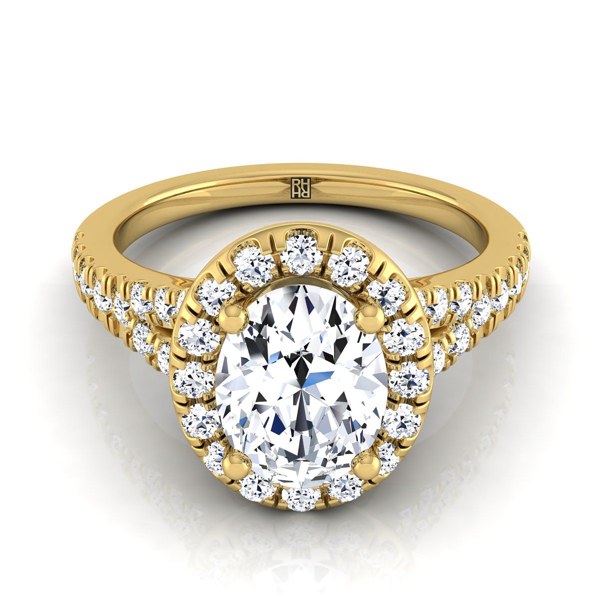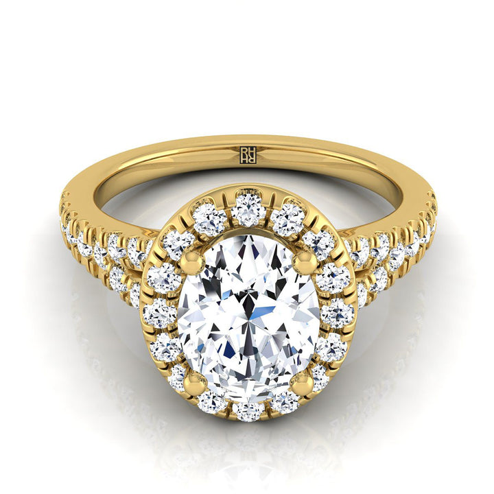 แหวนหมั้นเพชรทรงรีทองคำเหลือง 18K แบบหนามเตยเรียบพร้อมฮาโลแบบหนามเตยและแถบแยกเล็กประดับเพชร 1/2ctw