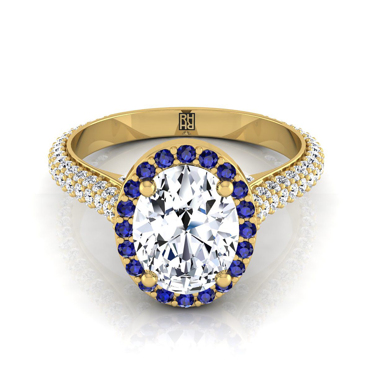แหวนหมั้นเพชร 14K ทองเหลืองรูปวงรีไมโคร-ปาเว่ ฮาโลว์ พร้อมเพชรข้างแบบปาเว่ - 7/8ctw