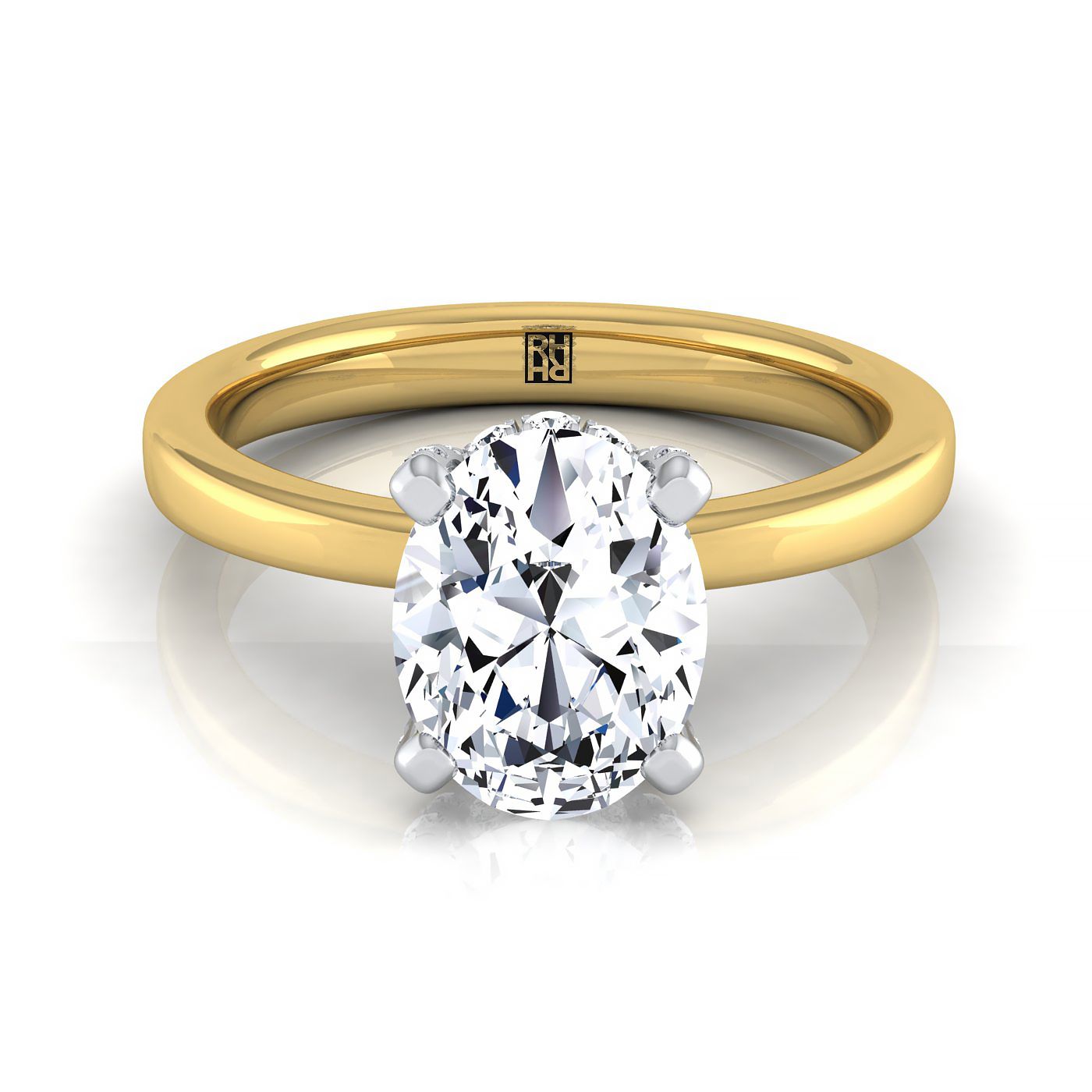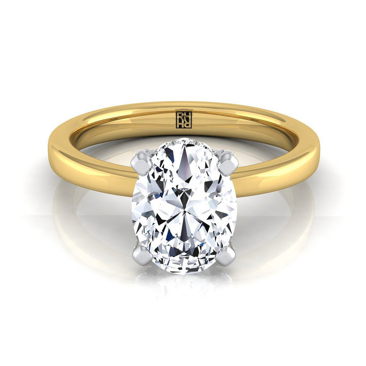 แหวนหมั้นเดี่ยวมงกุฎตะกร้าซ่อนเพชรทรงรีทองคำเหลือง 14K น้ำหนักเพชรรวม 1/10 กะรัต