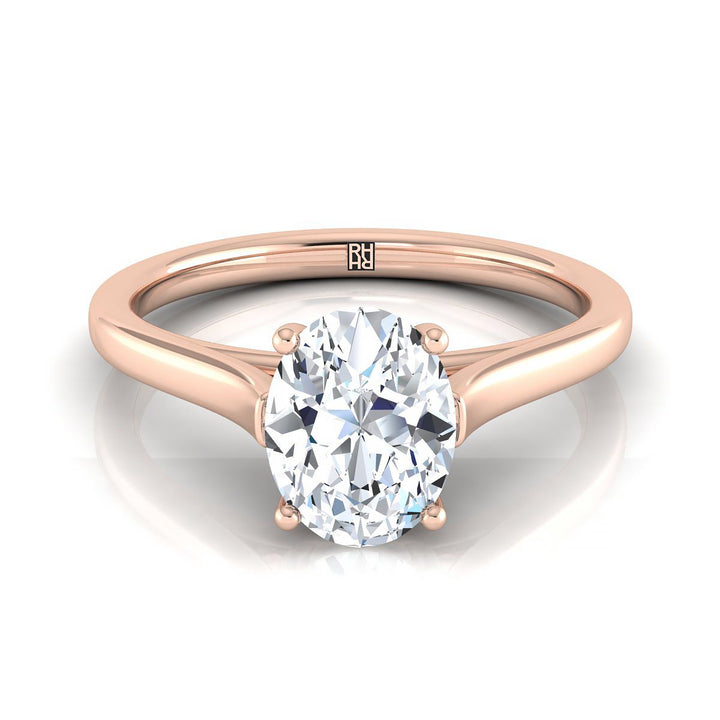 แสดงสไตล์คลาสสิก แหวนหมั้นโซลิแทร์รูปวงรีนี้มีขอบชั้นสี่เหลี่ยมและการตั้งแบบวิหารในทองกุหลาบ 14k