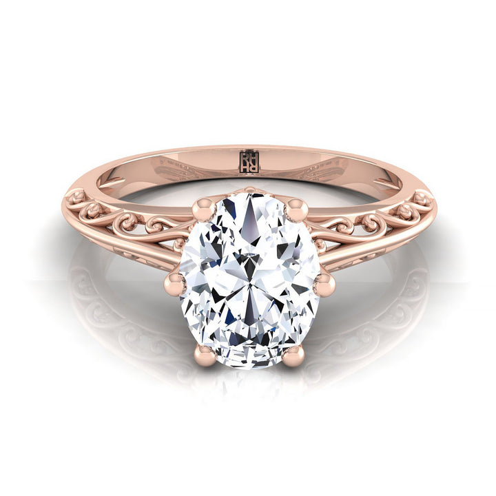 ความสง่างามที่เรียบง่าย แหวนหมั้นเพชรรูปวงรีนี้แสดงให้เห็นถึงแถบวงแหวนที่ค่อยๆ ขยายพร้อมลวดลายสลักแบบม้วนในตัวเรือนทองกุหลาบ 14 กะรัตคลาสสิก