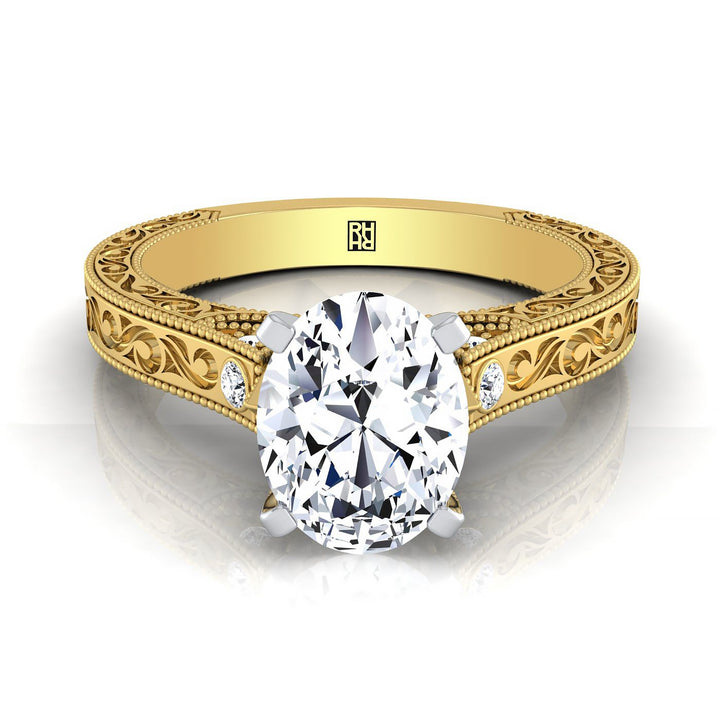 แหวนหมั้นแกะสลักด้วยมือโบราณประดับเพชรละเอียดรูปวงรีทองคำเหลือง 14K - 1/10ctw