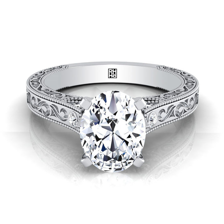 แหวนหมั้นแกะสลักด้วยมือโบราณประดับเพชรละเอียดรูปวงรีแพลทินัม -1/10ctw