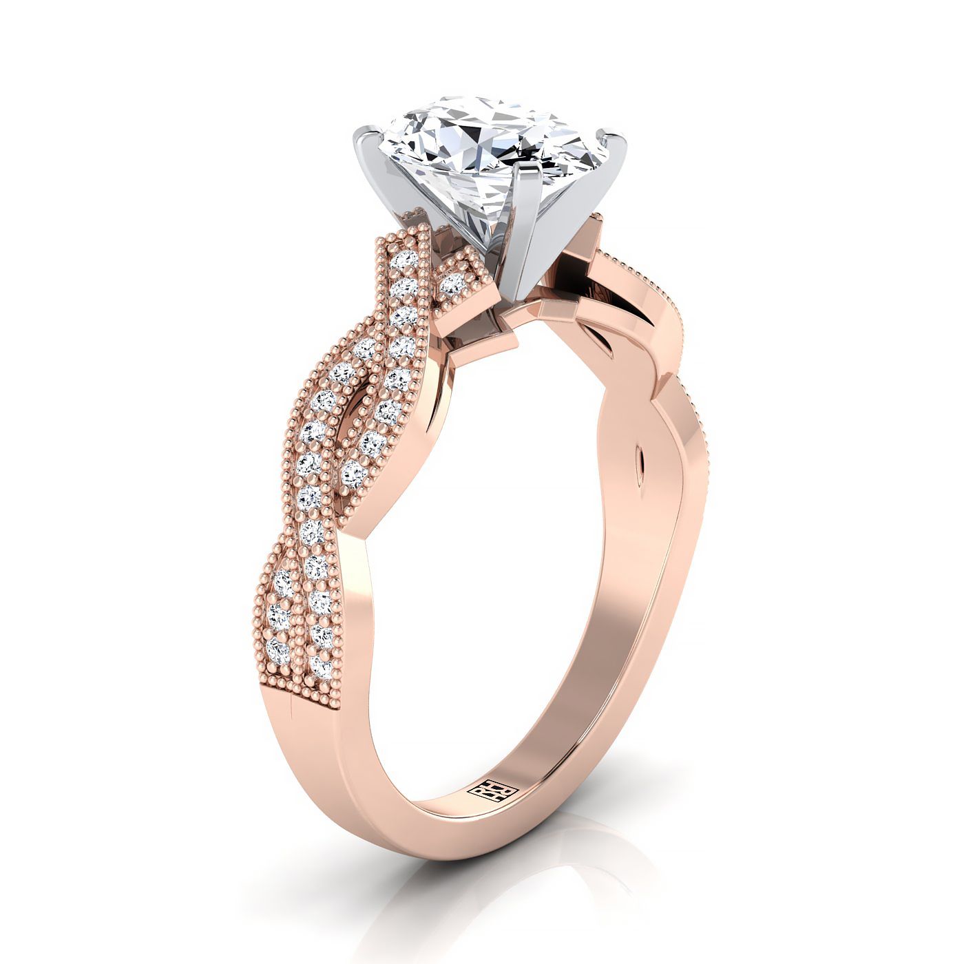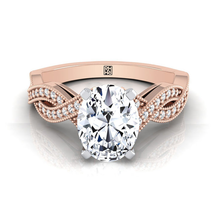 แหวนหมั้นรูปวงรีที่มีเสน่ห์ พร้อมชิ้นส่วนแถบวงแหวนแบบมิลเกรนสไตล์อินฟินิตี้ที่ประดับด้วยเพชรทรงกลมเจียระไนแบบบริลเลียนต์ (h-i/vs 0.20ctw) ประดับอย่างสวยงามในทองกุหลาบ 14 กะรัต