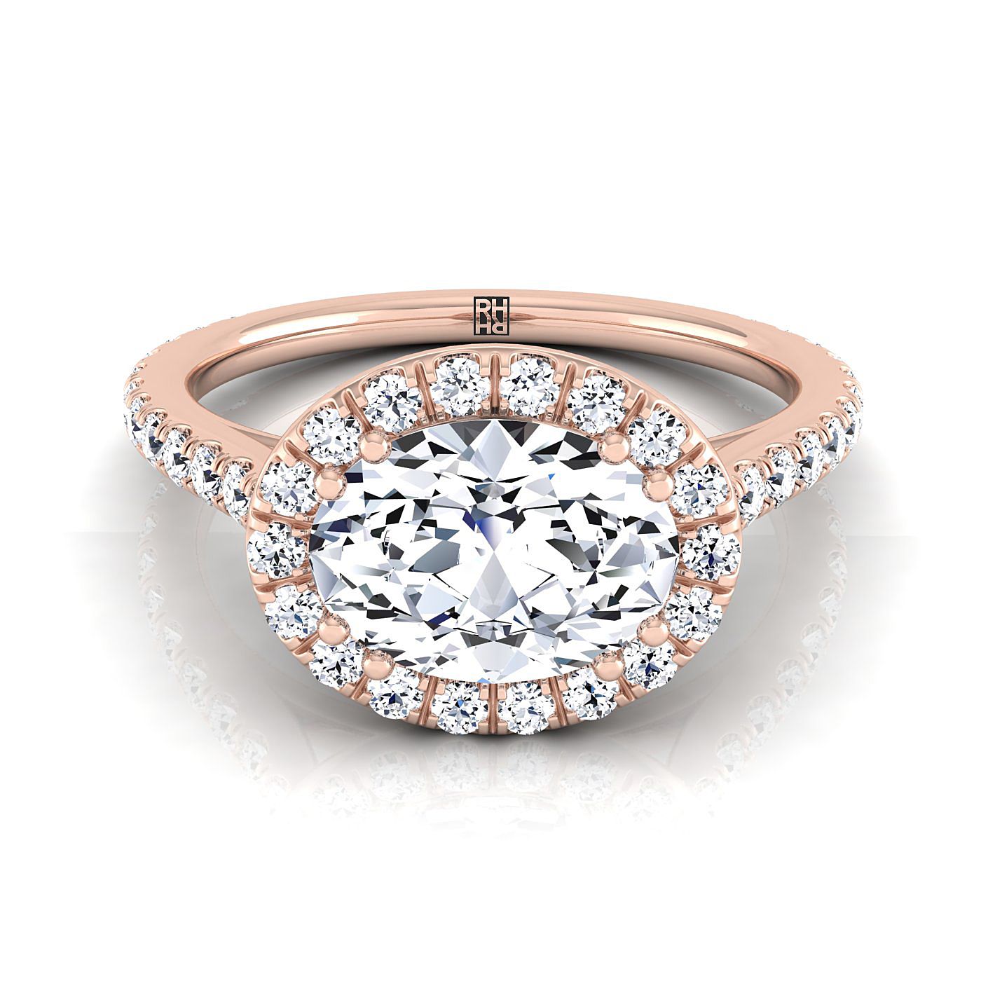 คลาสสิกและสง่างาม แหวนหมั้นรูปทรงวงรีแบบ Halo เพชร (ทิศตะวันออก-ตะวันตก) พร้อมก้านแหวนแบบ Pave โชว์เพชรเจียระไนแบบ Brilliant Cut (h-i/vs 0.45ctw) ที่ประดับอย่างสวยงามในตัวเรือนทองกุหลาบ 14k คลาสสิก