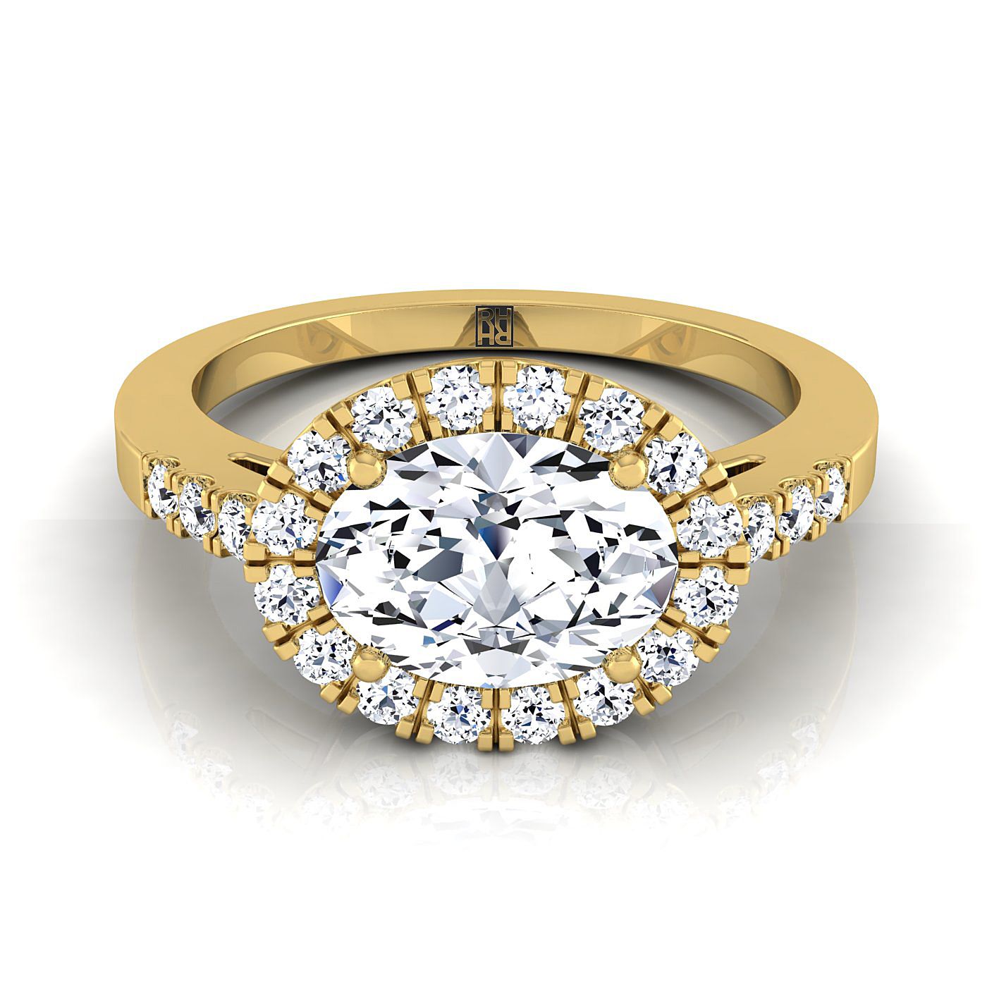 คลาสสิกและสง่างาม แหวนหมั้นรูปทรงวงรีเพชรฮาโล (ทิศตะวันออก-ตะวันตก) พร้อมชิ้นส่วนชองค์แบบปาเว่ แสดงให้เห็นเพชรเจียระไนแบบบริลเลียนต์ (h-i/vs 0.33ctw) ที่ตั้งอย่างสวยงามในตัวเรือนทองคำสีเหลือง 14k คลาสสิก