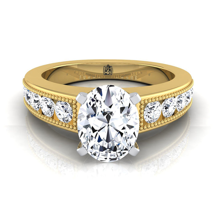 แหวนหมั้นทองคำเหลือง 18K รูปไข่ ประดับเพชร สไตล์โบราณ มิลเกรน บีด และเซ็ตแบบแชนเนล - 1/2ctw