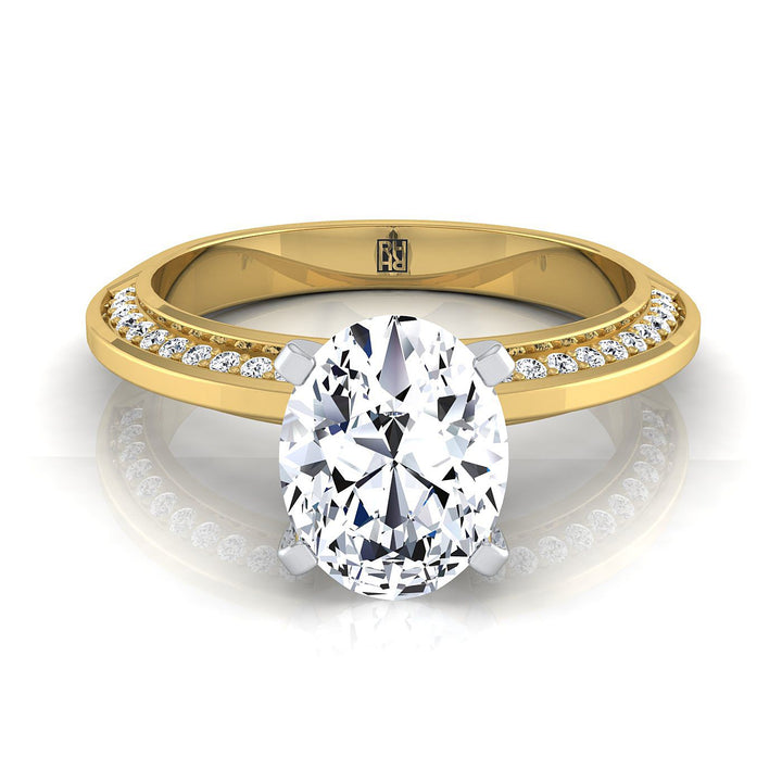 แหวนหมั้นเพชรทรงวงรีคลาสสิกพร้อมแหวนเพชรเจียระไนแบบ Brilliant Cut (h-i/vs 0.20ctw) ที่ประดับอย่างสวยงามในกรอบทองคำสีเหลือง 14k ที่สง่างาม พร้อมการออกแบบขอบมีดและแกลเลอรีแบบ Pave