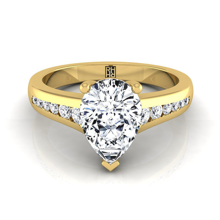 ผลิตด้วยมืออย่างประณีตในทองคำแท้ 18 กะรัต สีเหลือง การตั้งเพชรรูปทรงลูกแพร์แบบช่อง (h-i/vs 0.17 กะรัตรวม) สำหรับแหวนหมั้นนี้ สร้างการตั้งที่สมบูรณ์แบบสำหรับเพชรโซลิแทร์คลาสสิกที่จะคงอยู่ตลอดชีวิต