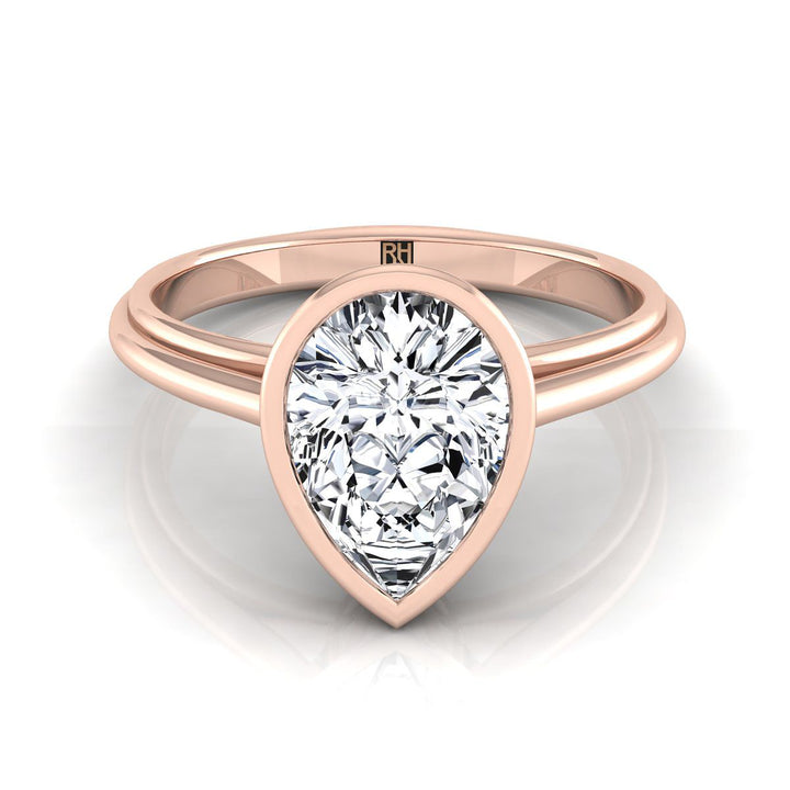 ความสง่างามที่เรียบง่าย แหวนหมั้นเพชรรูปทรงลูกแพร์นี้นำเสนอเพชรเดี่ยวแบบติดตั้งด้วยขอบในตัวเรือนทองกุหลาบ 14 กะรัตคลาสสิก
