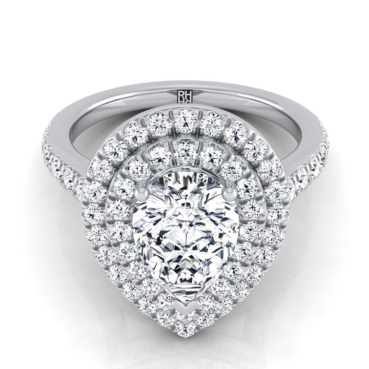 แหวนหมั้นเพชรทรงลูกแพร์กลางทองขาว 18K พร้อมฮาโลคู่แบบปาเว่และเพชรเส้นตรง - 7/8ctw