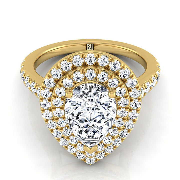 แหวนหมั้นเพชรทรงลูกแพร์กลางทองคำเหลือง 18K พร้อมฮาโลคู่แบบปาเว่และเพชรเส้นตรง - 7/8ctw