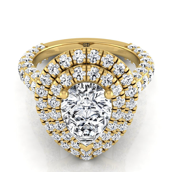 แสดงออกถึงสไตล์ที่สง่างาม แหวนหมั้นรูปทรงลูกแพร์แบบดับเบิลฮาโลที่ประดับด้วยเพชรเจียระไนแบบบริลเลียนต์ (h-i/vs 2.20ctw) พร้อมกับแถบเพชรที่ประณีต ติดตั้งในตัวเรือนทองคำ 18k สีเหลือง