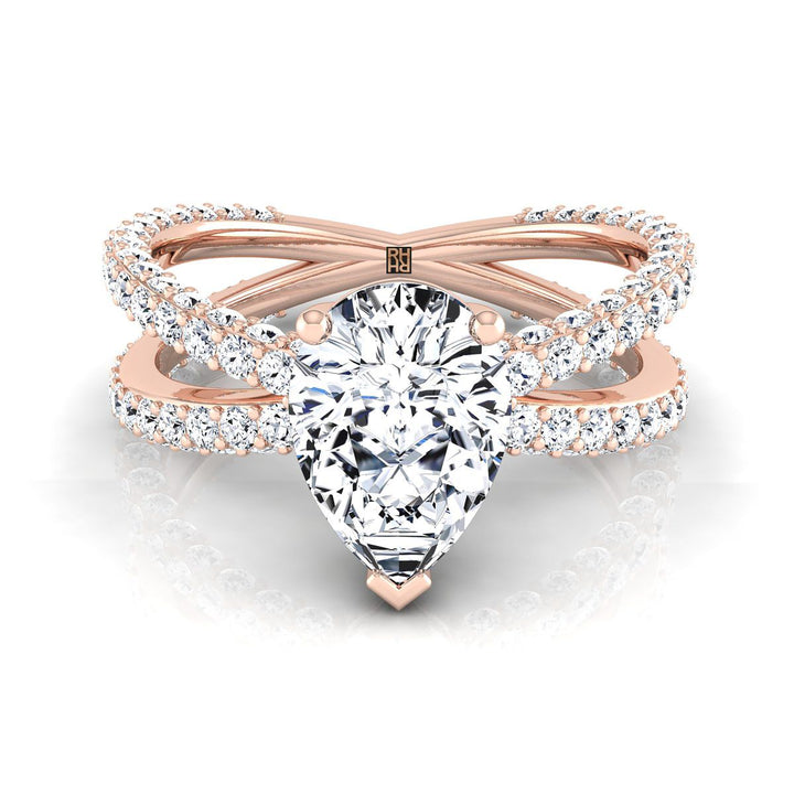 แถลงการณ์สไตล์สมัยใหม่ แหวนหมั้นรูปทรงลูกแพร์นี้มีดีไซน์แหวนบายพาสคลาสสิกที่แสดงให้เห็นเพชรเจียระไนแบบบริลเลียนท์ (h-i/vs 1.25ctw) อย่างสวยงาม ฝังแบบปาเว่ในตัวเรือนทองกุหลาบ 14 กะรัต