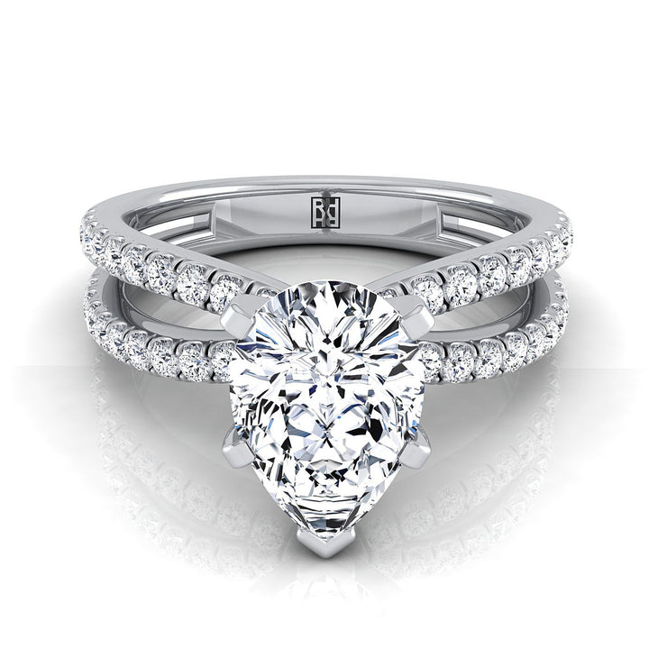 แหวนหมั้นเพชรทรงลูกแพร์คลาสสิกพร้อมชิ้นกลางที่มีเพชรเจียระไนแบบ Brilliant Cut (h-i/vs 0.35ctw) ประดับอย่างสวยงามในตัวเรือนทองคำขาว 18k แบบคลาสสิกที่มีชิ้นแยกแบบ Pave Split Shank