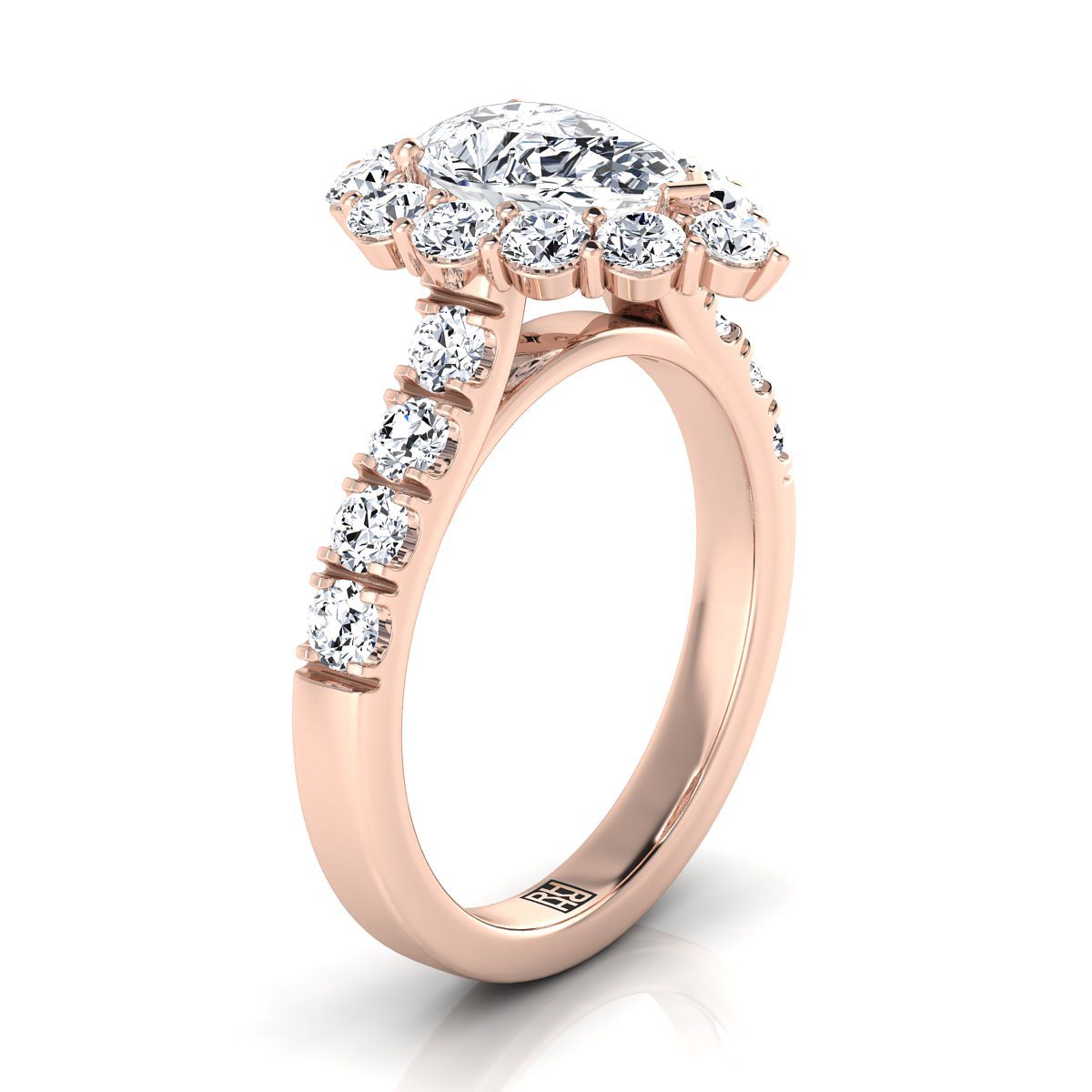 แหวนหมั้นสไตล์หรูหราประดับเพชรทรงลูกแพร์ตรงกลางทองกุหลาบ 14K พร้อมฮาโลฝรั่งเศสแบบปาเว่ 1-1/10 กะรัตรวม