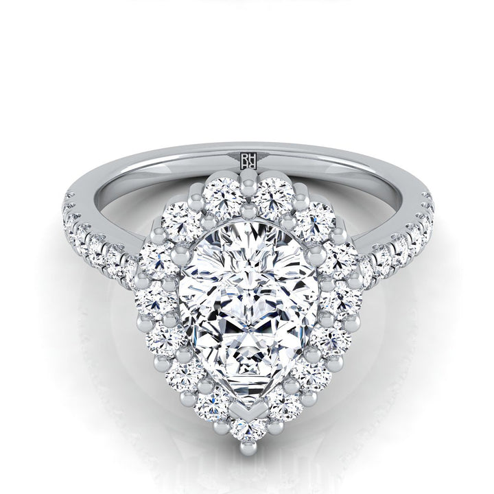 แหวนหมั้นเพชรทรงลูกแพร์กลางเม็ด 18K ทองขาว พร้อมฮาโลและหนามเตยร่วม - 5/8 กะรัตรวม