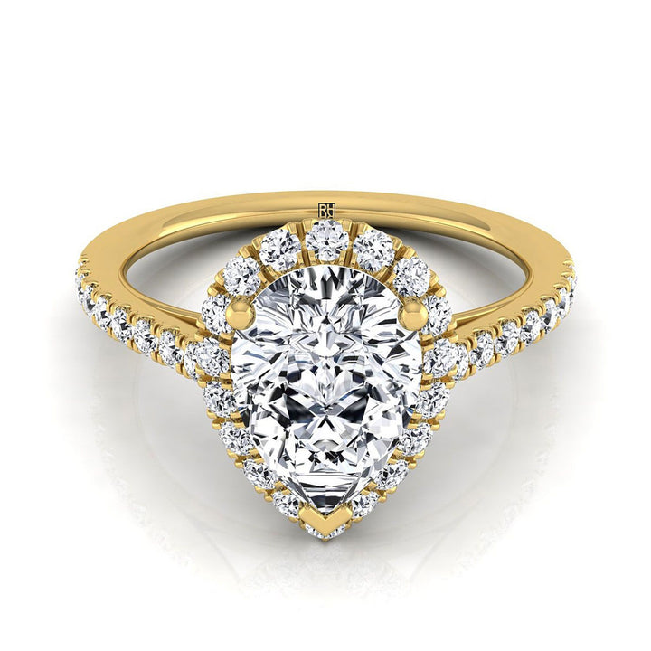แหวนหมั้นทองคำเหลือง 18K รูปทรงลูกแพร์ เพชรเม็ดกลาง พร้อมฮาโลขนาดเล็กและฝรั่งเศสปาเว - 3/8ctw