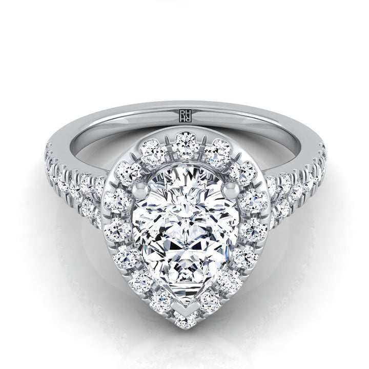 แสดงออกถึงสไตล์ที่สง่างาม แหวนหมั้นรูปทรงลูกแพร์แบบฮาโลที่ประดับด้วยเพชรเจียระไนแบบบริลเลียนต์ (h-i/vs 0.50ctw) พร้อมกับแถบแยกแบบเพฟที่ประณีต ติดตั้งในตัวเรือนทองคำขาว 18 กะรัต