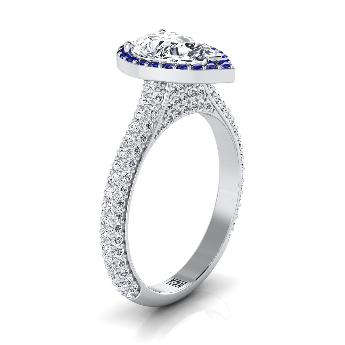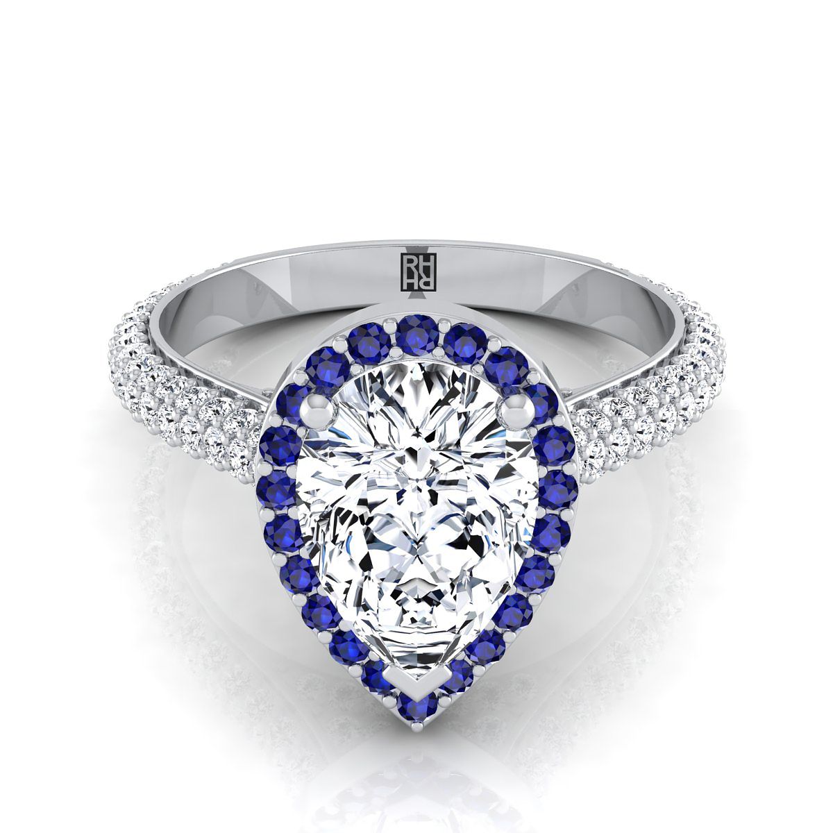 แหวนหมั้นทองคำขาว 14K รูปทรงลูกแพร์ ประดับไพลินตรงกลาง พร้อมไมโครปาเว่และฮาโลรอบข้าง ประดับเพชรข้างแบบปาเว่ - 7/8 กะรัตรวม