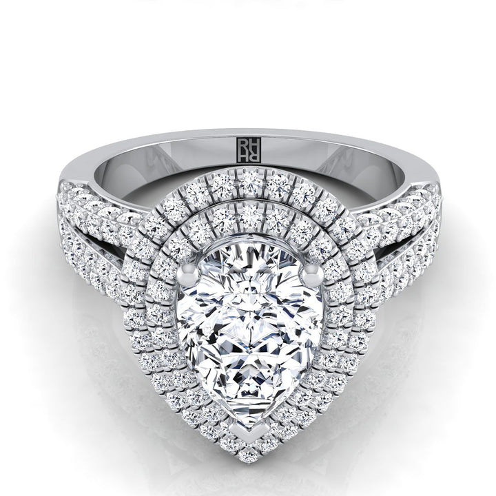 แสดงสไตล์อย่างสง่างาม แหวนหมั้นรูปทรงลูกแพร์แบบฮาโลที่ประดับด้วยเพชรเจียระไนแบบบริลเลียนต์ (h-i/vs 0.90ctw) พร้อมกับแถบเพชรแบบเพฟที่ประณีต ติดตั้งในตัวเรือนทองคำขาว 18 กะรัต