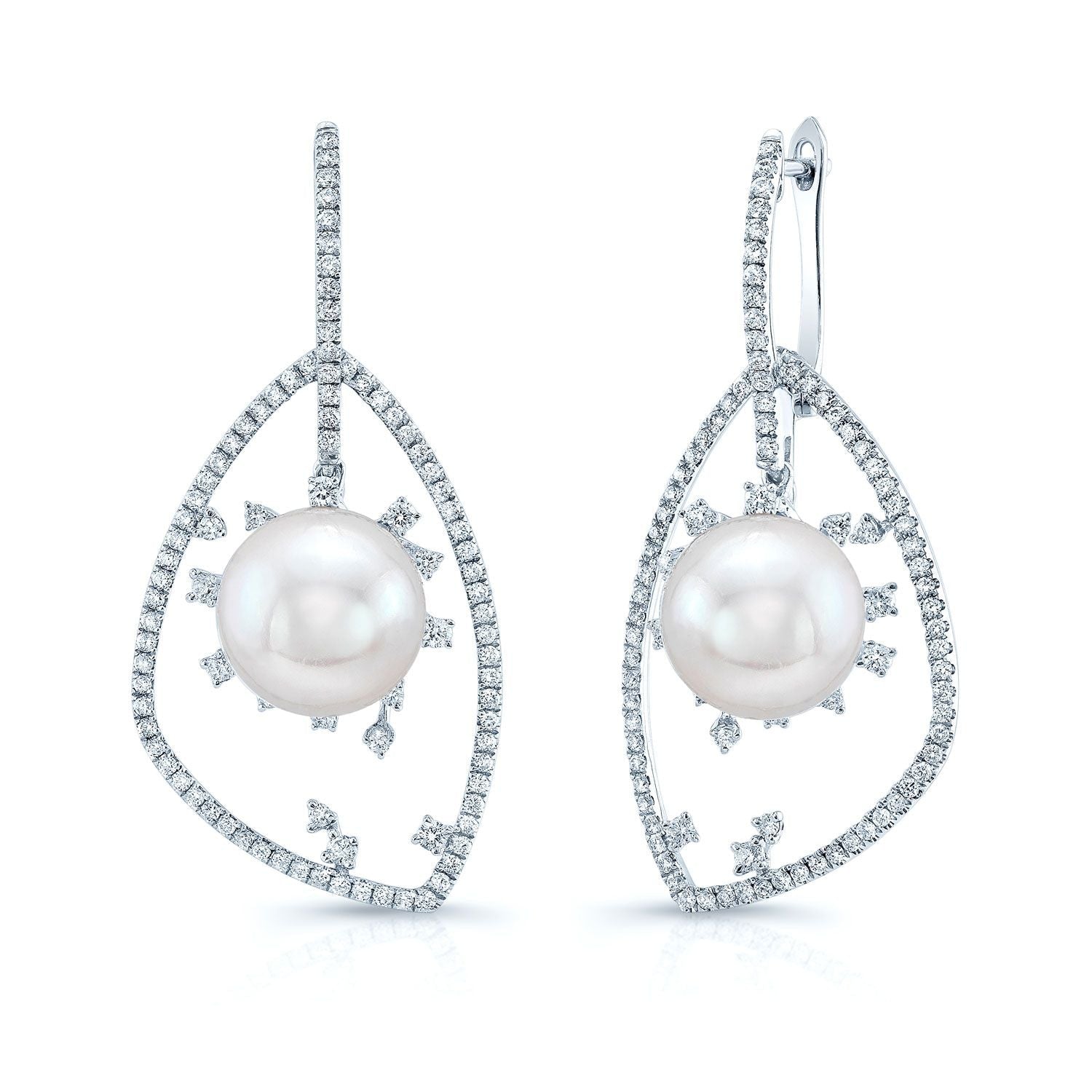 ต่างหูมุกและเพชรรูปดาวระเบิดพร้อมกรอบเรขาคณิตในทองคำขาว 14k