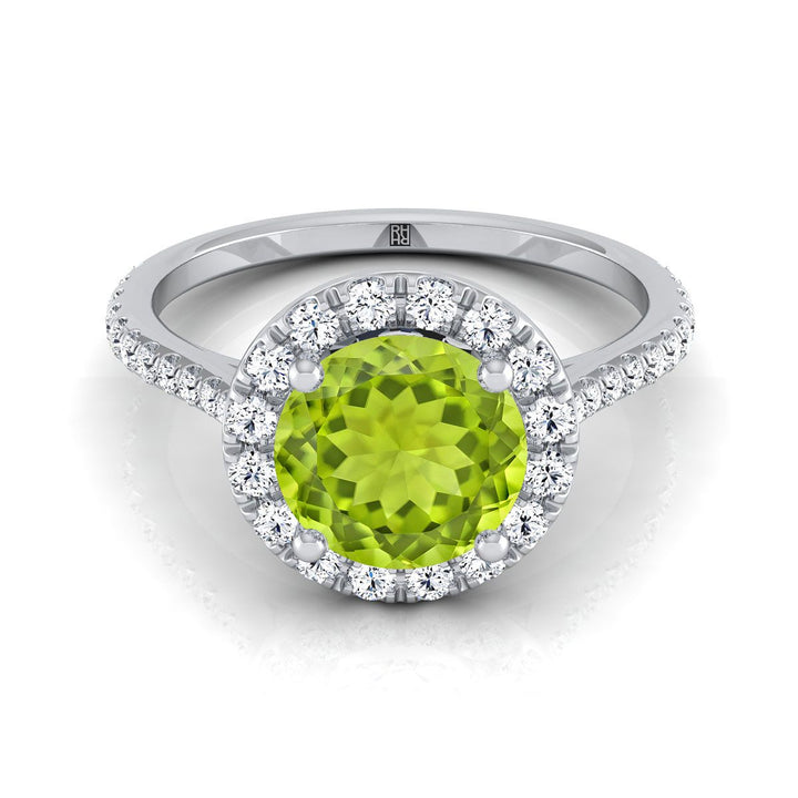 แหวนหมั้นแพลทินัมพร้อมเพชรประดับรอบ 6 มม. หินเพอริดอตทรงกลมตรงกลางและเพชรกลมเจียระไนแบบบริลเลียนต์ 40 เม็ด น้ำหนักรวม 0.40 กะรัต