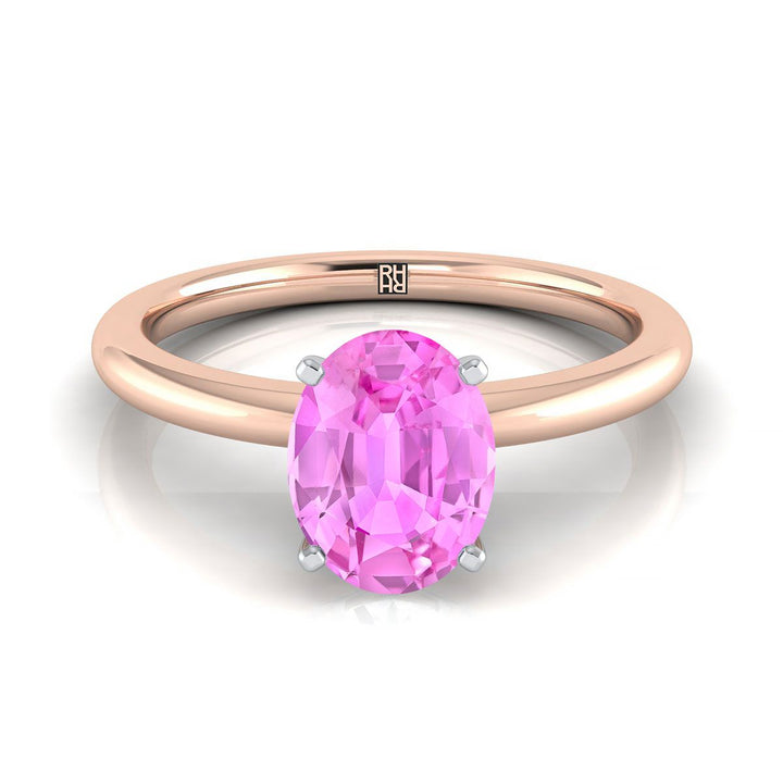 แหวนหมั้นทองคำ 14 กะรัต สีโรสโกลด์ พร้อมพลอยไพลินสีชมพูทรงรีขนาด 8 x 6 มม. ตรงกลาง และแหวนวงโค้งมน พร้อมการตั้งเม็ดหินแบบ 4 ก้านยึด