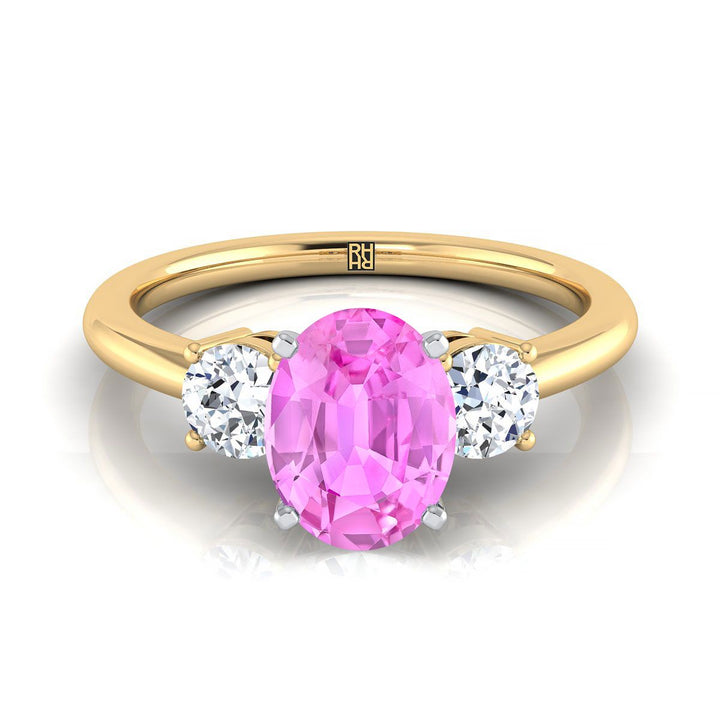 แหวนหมั้นเพชรสามเม็ดทรงกลมที่เข้าคู่กันอย่างสมบูรณ์แบบ ประกอบด้วยแซฟไฟร์สีชมพูรูปวงรีทองคำเหลือง 14K - 1/4ctw