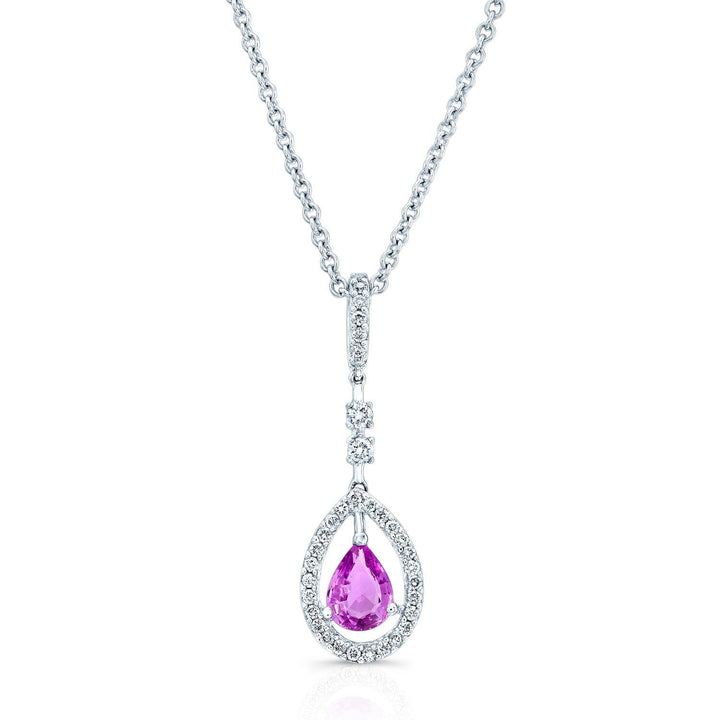 จี้ทองคำขาว 14 กะรัต พร้อมไพลินสีชมพูรูปทรงลูกแพร์ขนาด 5x7 มม. และเพชรทรงกลมเจียระไนแบบ Brilliant จำนวน 35 เม็ด น้ำหนักรวม 0.33 กะรัต พร้อมสายเคเบิลยาว 17 นิ้ว (hi/si)