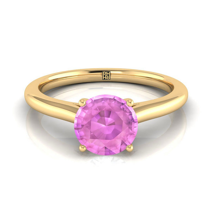 แหวนหมั้นทองคำ 14k สีเหลือง พร้อมพลอยไพลินสีชมพูทรงกลมขนาด 6 มม. ตรงกลาง และการตั้งแบบวิหาร พร้อมก้านแหวนทรงครึ่งวงกลม.