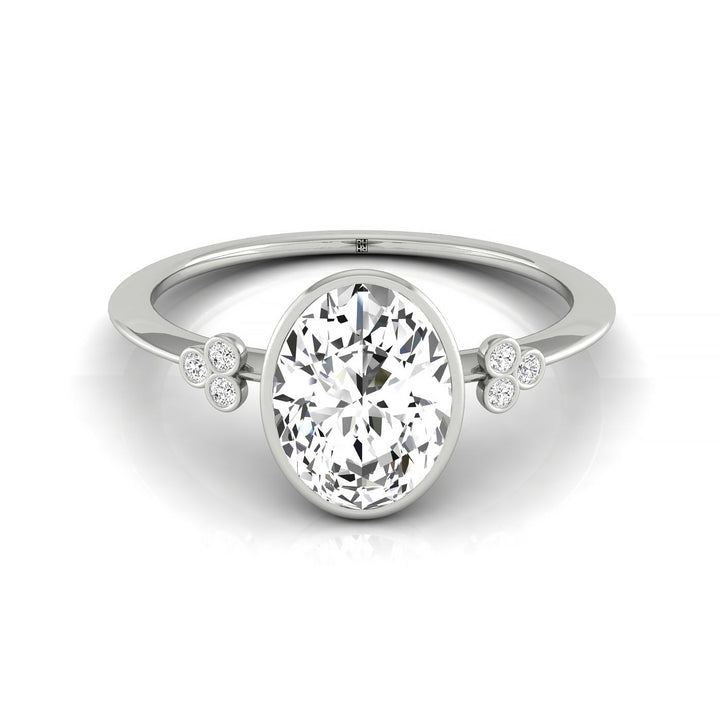 แหวนหมั้นรูปไข่แบบขอบเพลทพร้อมเพชรรูปกลม 6 เม็ดแบบขอบโคลเวอร์บนวงแหวน