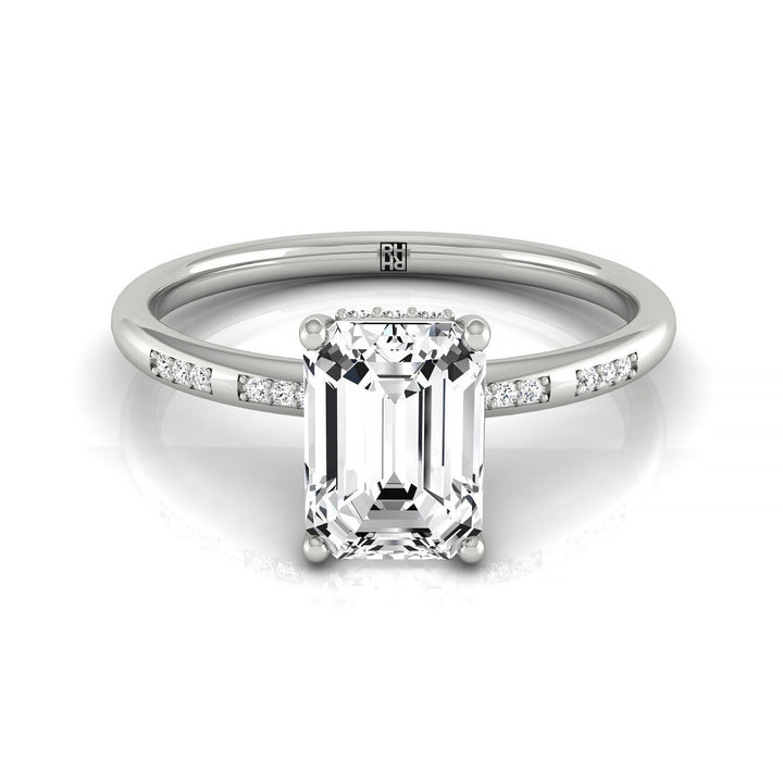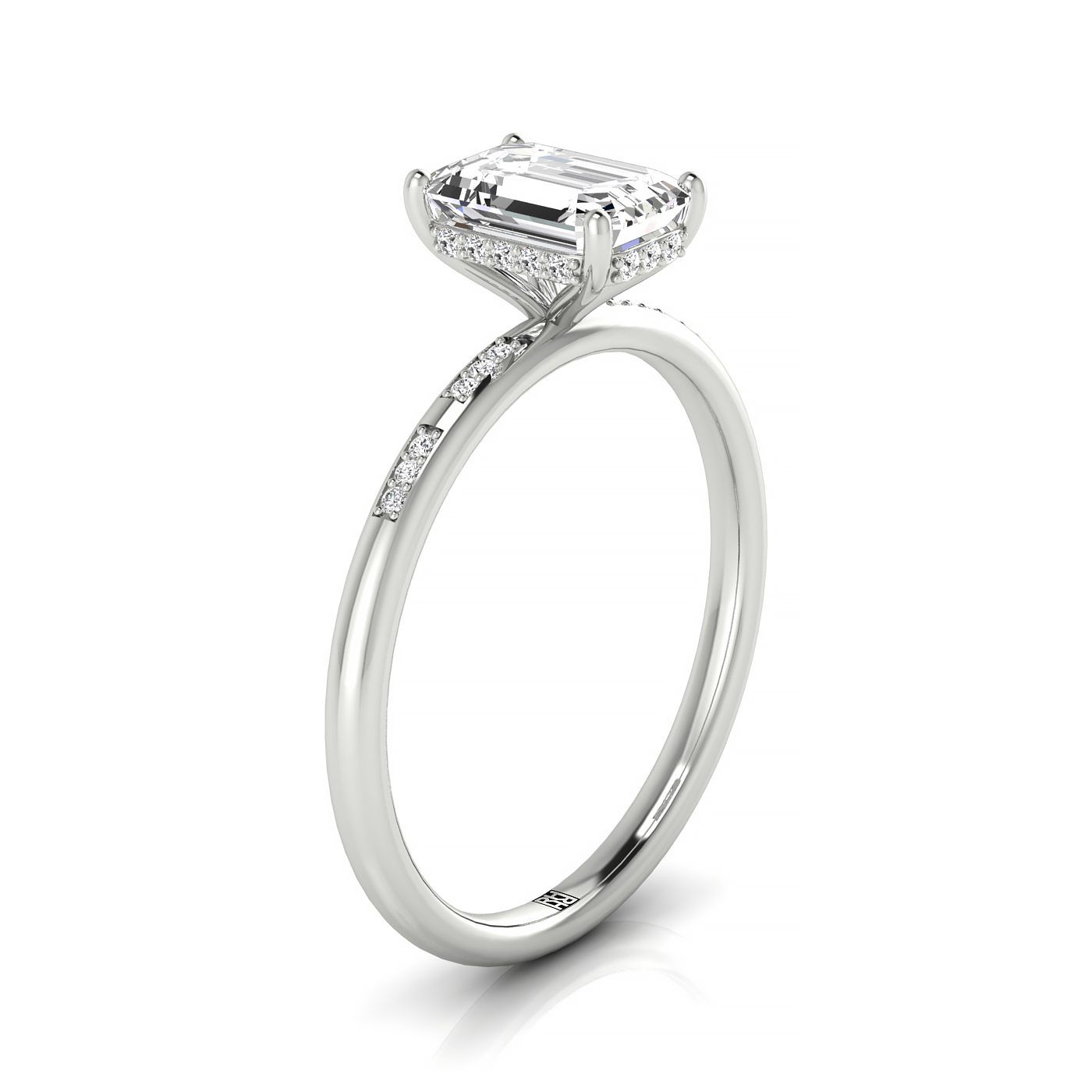 แหวนหมั้นมรกตแพลทินัมพร้อมฮาโลซ่อนสูงและเพชรรูปกลม 28 เม็ดแบบตั้งด้วยกรงเล็บ