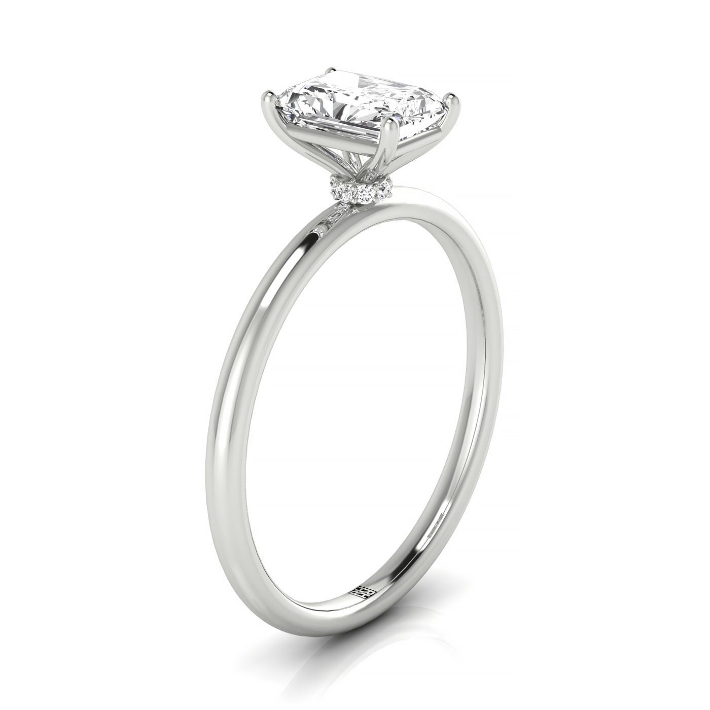 แหวนหมั้นเพชรเดี่ยวแพลทินัมเรเดียน พร้อมฮาโลซ่อนและเพชรรอบแบบ 8 กรง