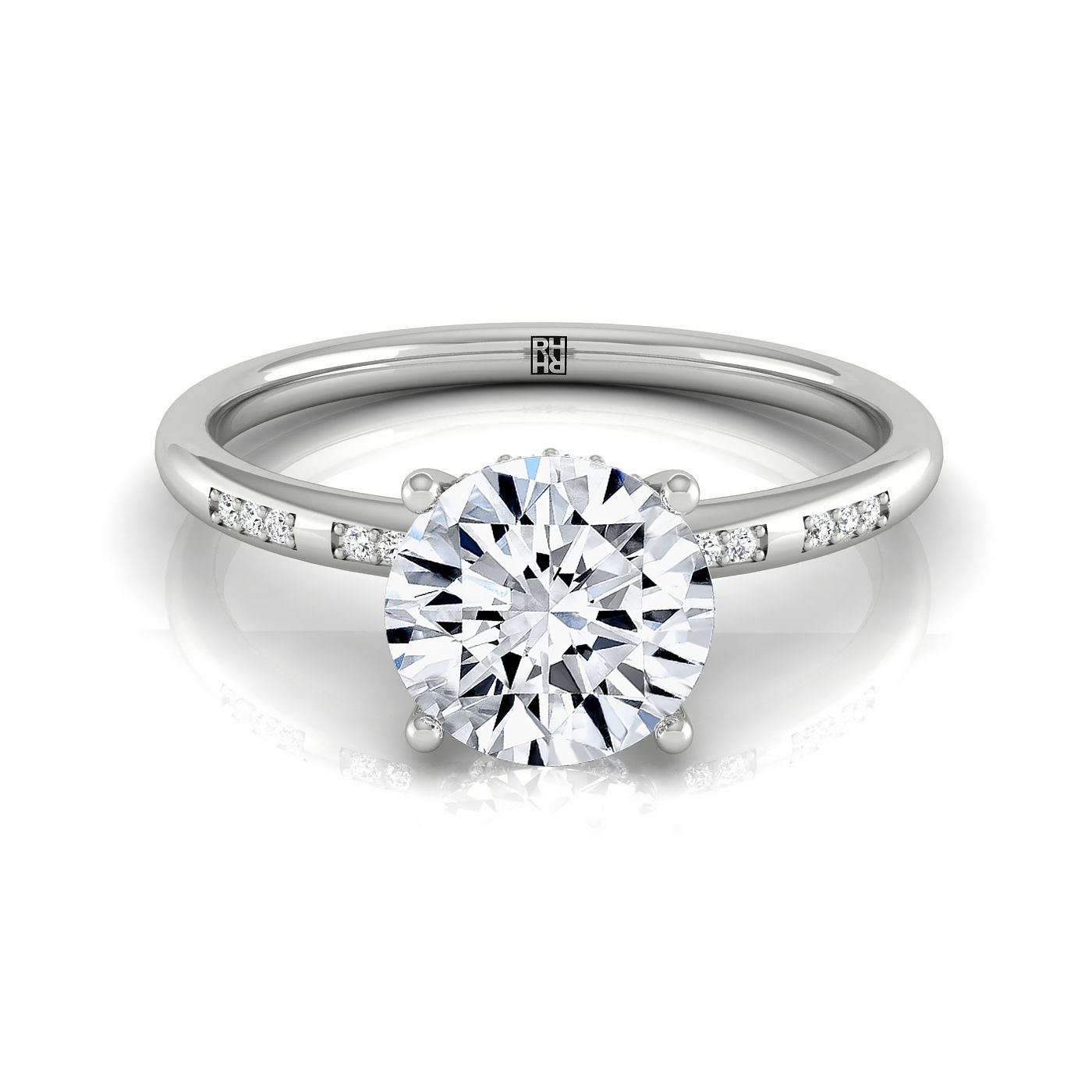 แหวนหมั้นทรงกลมแพลตินัมพร้อมฮาโลซ่อนสูงและเพชรรูปกลม 26 เม็ดแบบตั้งด้วยกรงเล็บ