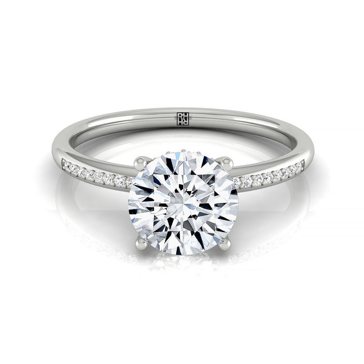 แหวนหมั้นทรงกลมแพลตินัมพร้อมฮาโลซ่อนสูงและเพชรรูปกลม 32 เม็ดแบบตั้งด้วยกรงเล็บ