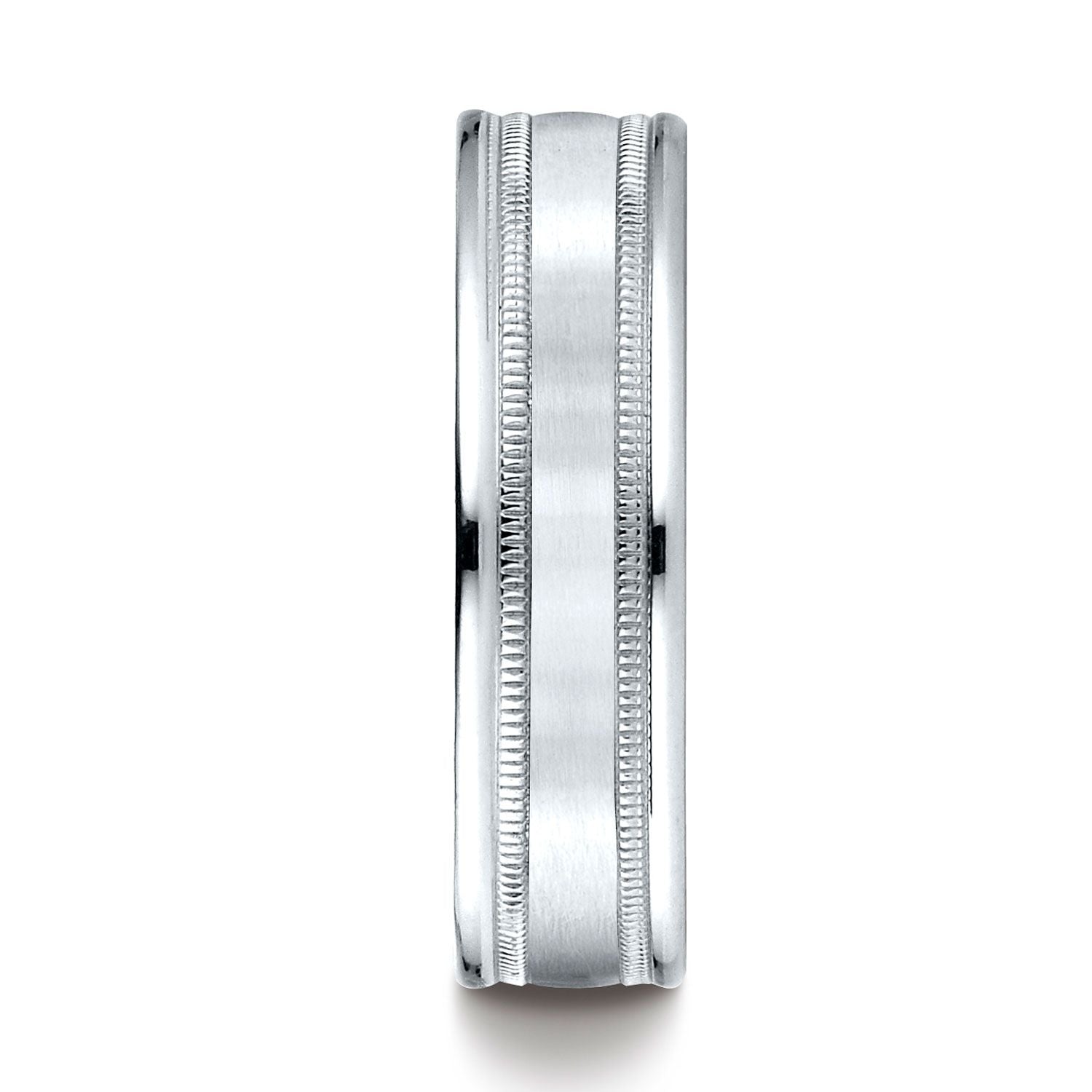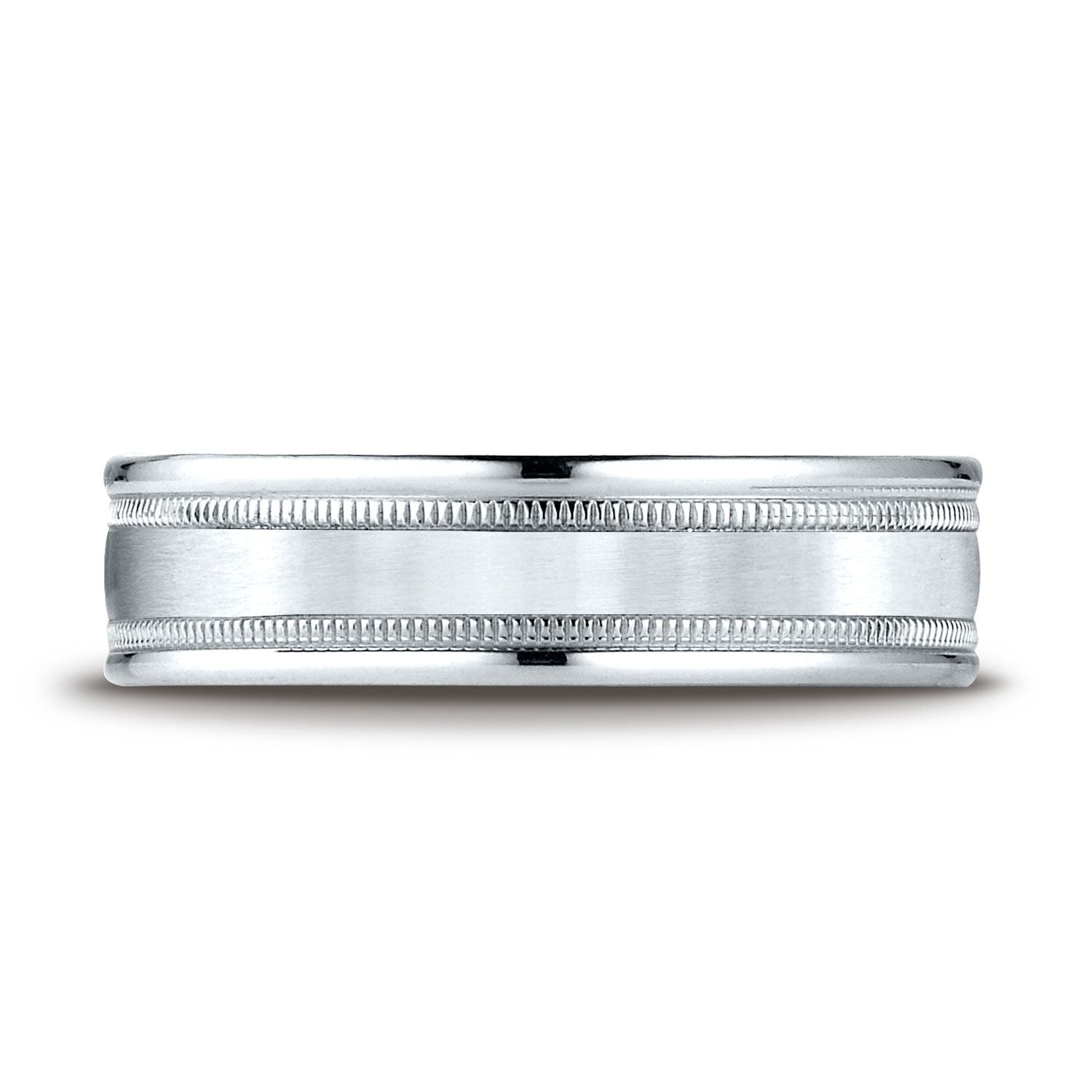แหวนดีไซน์แกะสลักแบบสวมใส่สบายกว้าง 6 มม. ที่สวยงามนี้ทำจากแพลทินัม มีผิวด้านตรงกลางพร้อมลายมิลเกรนและขอบโค้งมน