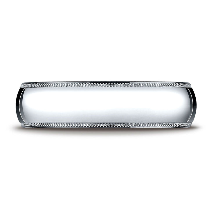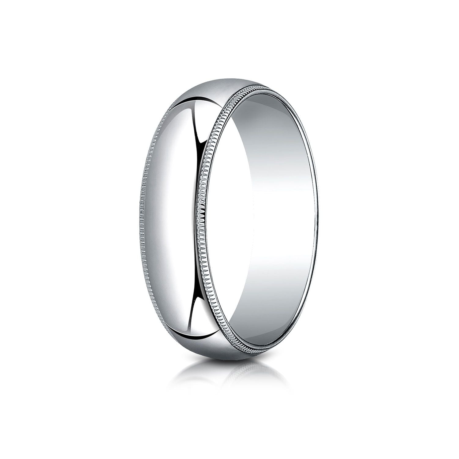 แหวนแพลตตินั่ม 6 มม. ที่โดดเด่นนี้มีพื้นผิวโค้งเล็กน้อยพร้อมขอบมิลเกรนและด้านในแบนเพื่อโปรไฟล์แบบดั้งเดิม